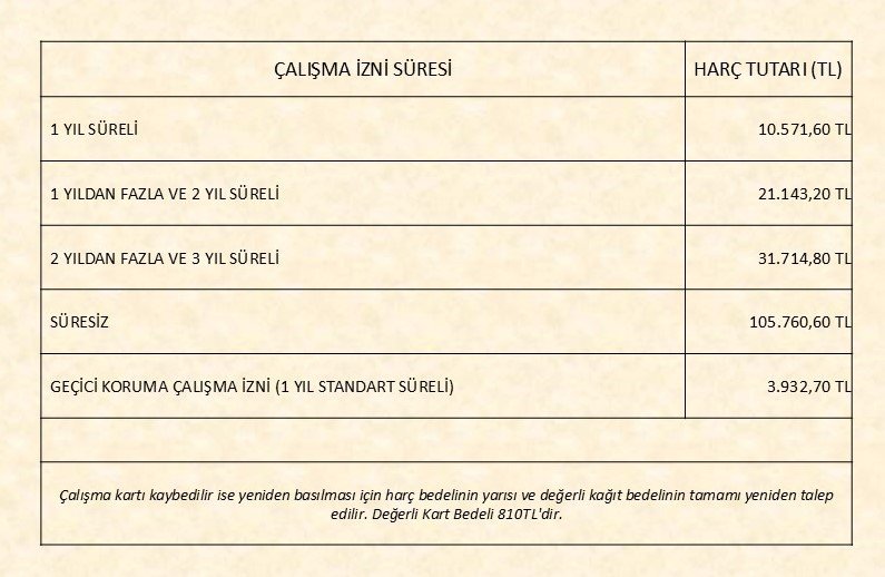 7.910TL olan 1 yıllık çalışma izni harç ücreti 10.572TL’ye yükselmiştir. Ayrıca 565 TL değerli kağıt bedeli de 810 TL’ye yükselmiştir.